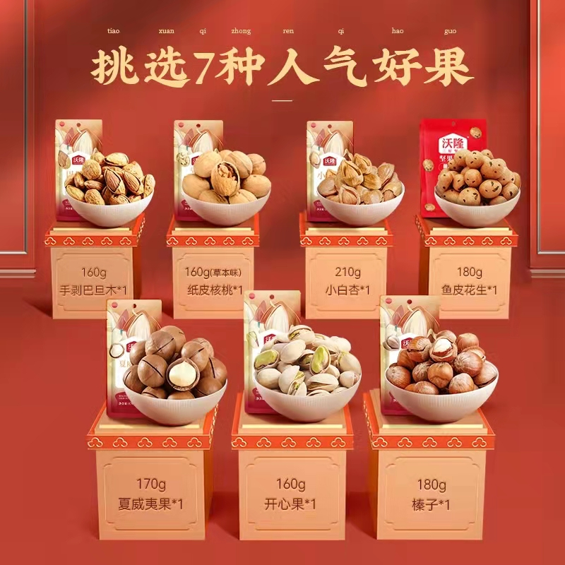 沃隆坚果礼盒挑选了7种人气坚果,足足1220g,营养满满、诚意满满。